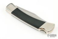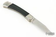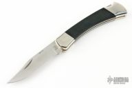 This lock back folder by Buck features a satin finished clip point blade with nail nick. The handle has nickel silver frame, black G-10 inlays with red canvas micarta liners. Comes with black leather sheath, original box and papers. Has a few light scratches, otherwise excellent condition.