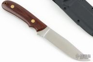 This Dozier Pro-Guide Pattern Knife from Dan Crotts features a satin finish clip point flat ground blade with .165" blade stock and 1.054" blade depth, full tang construction. The handle brown canvas micarta scales with brass pins and lanyard tube. Includes kydex sheath with belt loop. Excellent condition.