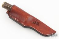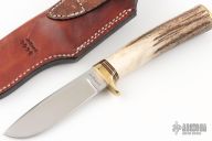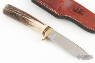 This Hunter by Paul LeBatard features a satin finished blade with .161" blade stock and .960" blade depth, hidden tang construction. The handle has a brass guard and butt with amber stag grip with black/brass spacers. Comes with a brown leather sheath. Excellent condition. #1054