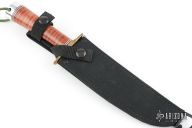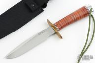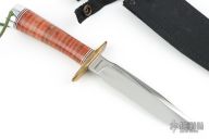 This Model 5 by Blackjack Knives features a mirror finished blade with a false top edge, .208" black stock and 1.111" blade depth, hidden tang construction. The handle has a brass guard, stacked leather grip with red/white/black spacers, aluminum butt. Comes with a black nylon sheath. Has some light scratches, otherwise excellent condition.
