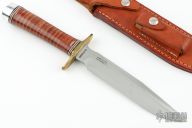 This Model 1-7 by Blackjack Knives features a satin finished blade with a false top edge, .210" black stock and 1.190" blade depth, hidden tang construction. The handle has a brass guard, stacked leather grip with red/white/black spacers, aluminum butt. Comes with brown leather sheath. Has some light scratches, otherwise excellent condition.