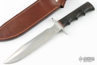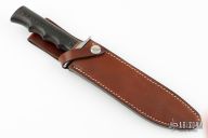 This R1 Military Classic by Cold Steel features a satin finished blade with sharpened top edge, .209" blade stock and 1.171" blade depth, hidden tang construction. The handle has a stainless steel guard, red white and black spacers and black linen micarta grip with finger grooves. Includes brown leather sheath with belt loop. Has been refinished and most of the markings have been removed, but you can still see the start of the "R1 Military Classic" on the blade, I believe the finger grooves were added by the previous owner, and are well done, otherwise good condition.