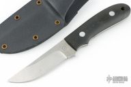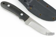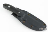 This K-4 Straight Hunter by Dozier Knives features a satin finished blade, .134" blade stock and .961" blade depth, full tang construction. The handle has black linen micarta scales with aluminum pins and lanyard hole. Comes with kydex sheath with belt loop. Has some light scratches and patina, otherwise excellent condition.