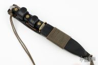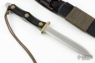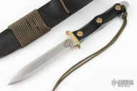 The M4 is one of EKs most popular models with a satin finish double edged blade. The handle is micarta with a milled "Handprint" pattern for sure grip and the brass "X" head pins. Brass double guard Full tang construction with thickness of .148" and depth of 1". Tang extends 3/4" at the butt with a lanyard hole.  Includes a black leather sheath. Comes with original box. Excellent condition.
