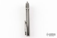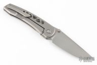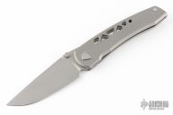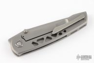 This Waka by Edison Barajas features a blasted blade with notched thumbrest and dual thumbstuds, can be front flipped. The handle has a milled and blasted titanium frame with matching backspacer and tip up clip with hidden screws. Has custom pivot. Rides on bearings, nice detent, lockup and blade seating. Comes with original box and COA.  New from Maker!