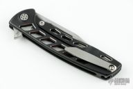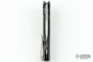 This Evo Typhoon from Brian Nadeau features a satin finished blade with a fullers, flipper and thumbrest. The handle is comprised of a black PVD titanium frame that is "Aspirated", satin titanium tip up clip. Rides on bearings, nice detent, lockup and blade seating, stainless lockface insert. Has a couple light scratches on the clip, otherwise excellent condition. Comes with a Sharp by Design box.
