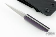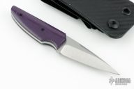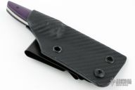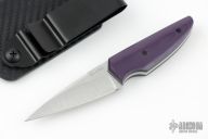 This knife by David Lancaster Clark features a satin finished blade with false top edge, .124" blade stock and .758" blade depth, full tang construction with purple G-10 scales and black liners. Comes with a kydex sheath with clip. New from maker.