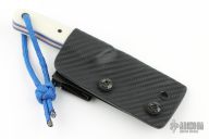 This knife by David Lancaster Clark features a satin finished blade with false top edge, .119" blade stock and .844" blade depth, full tang construction with white G-10 scales and red/blue liners. Comes with a kydex sheath with Ulti-clip. New from maker.