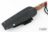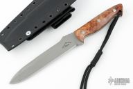 This fixed blade by David Dempsey features a bead blasted spear point blade, .196" blade thickness and 1.010" blade depth, full tang construction. The handle has maple burl scales and black liners. Nice feel in the hand. Comes with kydex sheath with clip and COA. Has some light sheath marks on the blade, otherwise excellent condition.