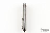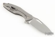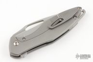 This Arius by Koenig knives features a Burnished finished blade with polished flats thumbhole and flipper. The handle has a bead blasted and patterned titanium frame with a titanium tip up clip, titanium backspacer. Has ceramic bearings and a ceramic detent ball. Nice detent, lockup and blade seating. Comes with original box and COA March 21, 2022, Gen4.  Excellent condition.