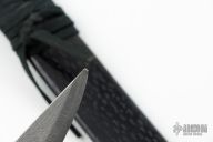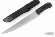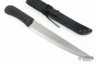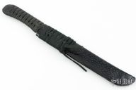 This long tanto by Phill Hartsfield has a satin finished chisel ground blade with .075" blade stock and 1.372" blade depth, full/hidden tang construction. Handle is epoxied black cord wrap. Comes with a kydex sheath. The tip has been broken off, has some nicks in the blade edge, otherwise good condition.