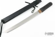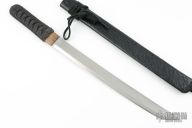 This Extra Long Tanto by Phill Hartsfield features a double ground tanto style blade with .125" blade stock and 1.162" blade depth, hidden tang construction. The handle has a copper habiki and epoxied cord wrap. Includes a paper lined metal sheath with black leather exterior. Excellent condition.