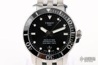 Stainless steel case with a stainless steel bracelet. Uni-directional rotating stainless steel bezel with an inlaid blue ceramic ring. Blue dial with luminous silver-tone hands and dot hour markers. Minute markers around the outer rim. Dial Type: Analog. Luminescent hands and markers. Date display at the 6 o'clock position. Powermatic 80.111 automatic movement, containing 23 Jewels, bitting at 28800 vph, and has a power reserve of approximately 80 hours. Scratch resistant sapphire crystal. Screw down crown. Transparent case back. Round case shape. Case size: 43 mm. Case thickness: 12.7 mm. Band width: 21 mm. Fold over clasp with a safety release. Water resistant at 300 meters / 1000 feet. Functions: date, hour, minute, second. T-sport Series. Dive watch style. Watch label: Swiss Made. Tissot SEASTAR 1000 POWERMATIC 80 Automatic Blue Dial Men's Watch. Includes the box and papers. Excellent Condition.