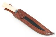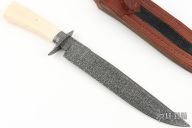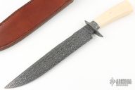 This Bowie from Master Smith Bill Buxton features a Mosaic Ws Damascus blade with false top edge, .240" blade stock and 1.596" blade depth, hidden tang construction. The handle has a Damascus guard and fluted collar, walrus ivory grip. Includes a hand tooled brown leather sheath with belt loop and snake skin inlay, and a zippered case. Excellent condition.  Comes with a COA dated 4-1-2013.