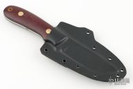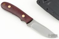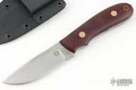 This K-72 Montana Hunter by Dozier Knives features a satin finished blade with .132" blade stock and 1.060" blade depth, full tang construction. The handle has burgundy linen micarta scales with brass pins and lanyard hole. Comes with kydex sheath with belt clip. New from maker.