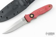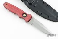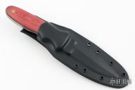 This KM-6 Arkansas Toothpick by Dozier knives features a satin finished blade with a false top edge, .171" blade stock and .919" blade depth, full tang construction. The handle has red linen micarta scales with black paper micarta insert and brass pins and lanyard hole. Comes with a kydex sheath. New from maker.