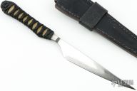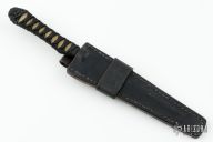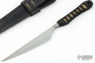 This "Dagger" by Don Fogg features a hand rub satin finished blade with nice gamon, .259" blade stock and .866" blade depth, hidden tang construction. The handle has a black cord wrapped trip over stingray skin. Comes with a black leather sheath with makers mark on the back and a zippered case. Excellent condition. This knife is not marked, and comes with a letter from Don Fogg verifying this knife since it is unmarked.