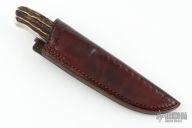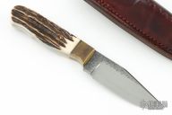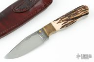 This knife from Don Fogg features a hand rub satin finished blade with forge finish flats and hamon, .188" blade stock and 1.212" blade depth, full tapered tang construction. The handle has hammered brass bolsters and wood scales. Includes a brown leather sheath and a padded zippered case.  Excellent Condition.