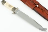 This bowie by Fred Carter has a hand rub satin finished blade with false top edge, .248" blade stock and 1.573" blade depth, hidden tang construction. The handle has an engraved nickel silver guard, collar and butt, mammoth ivory grip with scrimshaw. The scrimshaw done by Buster Warenski. Comes with a hand tooled brown leather sheath and a zippered case.