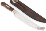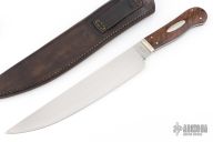 This knife features a 600 grit hand rub satin finished blade, .181" blade stock and 1.571" blade depth, full tang construction. The handle has nickel silver bolsters, stabilized black walnut scales with nickel silver escutcheons. Comes with a copy of the original listing from his website dated 4/8/99 declaring that this was the first knife he made in this style. It comes with a zippered case. Has some small pitted spot on the blade, otherwise excellent condition. Comes with brown leather sheath with silver concho by Roger Clark. Comes with COA dated March 22, 1999 noting that it is a prototype.
