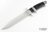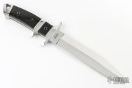 This is a Kressler design integral subhilt fighter by Boker Plus features a mirror polished blade with false top edge, .248" blade stock 1.266" blade depth, integral construction. The handle has integral guard, sub-hilt and butt with lanyard hole and black micarta inlays. Comes with original black leather sheath, box and papers. #0281 on blade spine. Excellent condition.