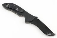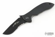 'The Emerson Commander is a 21st century combination of design, materials, performance, and razor sharpness. This knife along with other Emerson Knives, sets the new standard for the cutlery industry and continues to push the design and performance envelope for cutting tools well into the 21st century.' 'The Commander knife-battle tested and proven-incorporates some of the most advanced ergonomics ever featured on a folding knife. The knife, already in use with elite armed forces, European Military strike teams and NATO Counter-Terrorist units throughout the world was chosen by the U.S. Navy SEAL teams for issue to special units within the Naval Special Forces Units. Because of its ruggedness, it has become a favorite of hunters, outdoorsman and adventurers the world over. It features the patented 'wave shaped opening feature.' This production Commander linerlock folder has a black partially serrated blade and black G10 handle. Wave feature. 2003. Has some light scuffs and scratches, a slightly blunted tip, otherwise good condition. #3544