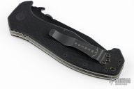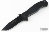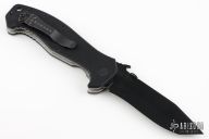 This CQC-15 by Emerson Knives has a black tanto recurve blade with thumb disc and notched thumb rest. Handle is black G10 with titanium liners, black standoffs, lanyard hole and tip up black stainless steel clip. Nice detent, lockup and blade seating. S/N 5540. Comes with original box and papers. Excellent condition.