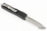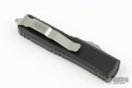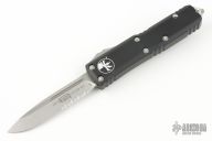 This UTX-85 by Microtech features a stonewash finished partially serrated blade. The handle has a black aluminum frame with blasted hardware and tip down clip. Comes with original box and papers. Dated 10/2021 and s/n 0072570. Includes the original box and papers.  Excellent Condition.