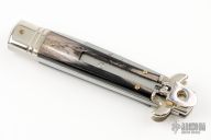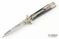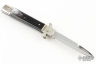 This Leverletto Lever Lock Auto has a mirror polished stainless steel spear point blade. Handle has buffalo horn scales, fluted nickel silver front and rear bolsters, stainless steel liners and back spacer, and nickel silver lock release button. Has some light scratches, otherwise excellent condition.