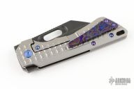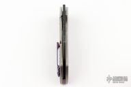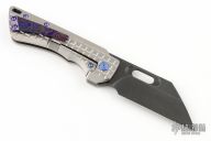 This Nymble Framelock Flipper by EMP EDC features a black blade with notched thumbrest and flipper, and a thumbhole. The handle has a tumbled and frag pattern milled titanium frame, after market mokuti backspacer and tip up clip. Comes with original box and papers.  Includes the original backspacer and pocket clip. Rides on bearings, nice detent, lockup and blade seating. Excellent condition.