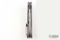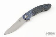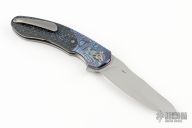 This Mini AWT by Brad Southard features a hand rub satin finished blade with notched thumbrest and flipper. The handle has mokuti bolsters, black/blue silver lightning strike carbon fiber scales, titanium pivot collars, bead blasted titanium liners, notched and anodized titanium backspacer, tip up bead blasted titanium clip. Nice detent, lockup and blade seating. Rides on bearings. Comes with a zippered case. Excellent condition.
