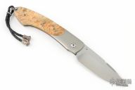 This B12 folder features a titanium frame with burl inlays. Citrine inlays in thumb stud and push button. The push button releases the lock and allows you to close the knife. Sterling silver lanyard bail and leather lanyard. Includes original box and leather sheath. Light scratches are visible on the blade otherwise the knife is in excellent condition. Blade Steel: ZDP-189