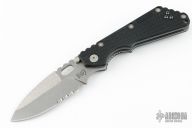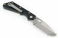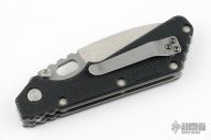 This is a Buck made Strider SNG Tarani has a stonewashed blade with notched thumbrest, thumbhole, partially serrated edge, and textured blade. The handle has textured black  scales, stainless steel liners and reversible tip up carry clip. Notching on thumbrest area and front/rear of handle provide a solid grip. Discontinued. Excellent condition.