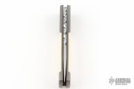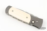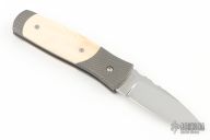 This Automatic by Z Custom Knives features a mirror polished drop point blade with file worked thumbrest. The handle is comprised of a bead blasted titanium frame with Mammoth inlays and inlaid push button over a fileworked stainless steel backspacer, tip up stainless steel clip. Has some light scuffs and scratches, otherwise excellent condition. Hard to find!
