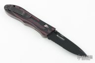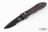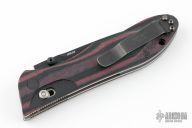 This Benchmade 730SBK Ares is an Allen Elishewitz design featuring a black finished drop point blade with sedge, serrations, and dual thumb studs. The handle is comprised of layered maroon and black G10 scales over steel liners and a black G10 backspacer. The black coated tip up clip is reversible for right or left hand carry. Lanyard hole in pommel. Has a couple scuffs, otherwise excellent condition.