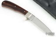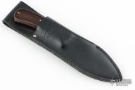 This hunter from Ka-Bar features a mirror polished blade with .138" blade stock and .836" blade depth, full tang construction. The handle has a nickel silver guard with dymondwood scales. Includes a black leather sheath. Has some light patina, otherwise excellent condition.