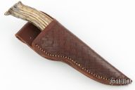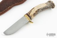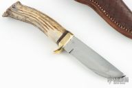 This knife by Larry Doores features a mirror polished blade with .182" blade stock and 1.255" blade depth, hidden tang construction. The handle has a brass guard and a crown stag grip with a leather spacer. Comes with a hand tooled brown leather sheath. Has some light scratches and a couple small oxidation spots, otherwise good condition.