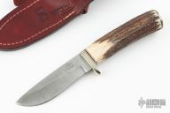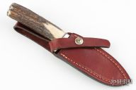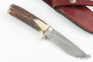 This knife by TD Bennett features a Damascus blade with .164" blade stock and 1.173" blade depth, hidden tang construction. The handle has a nickel silver guard and butt, stag grip, black/red/white spacers. Comes with a hand tooled brown leather sheath. Excellent condition.
