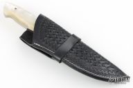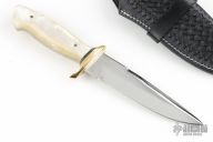 This knife features a mirror polished blade with false top edge, .196" blade stock and 1.137" blade depth, full tang construction. The handle has a brass guard, pearlex scales with black/brass spacers and brass pins. Comes with a black leather sheath. Excellent condition.