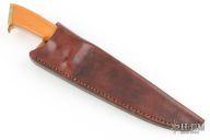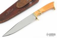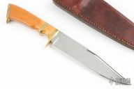 This Bowie by Ralph Turnbull features a mirror finished blade with a sharpened top edge, .163" blade stock and 1.379" blade depth, full tang construction. The handle has a brass guard, sub-hilt and butt, yellow paper micarta scales. Comes with a brown leather sheath. Has a few light scratches, otherwise excellent condition.