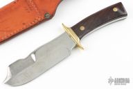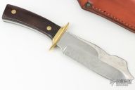 This bowie by Art Wiman features a satin finished clip point blade with sharpened top edge, .252" blade stock and 1.942" blade depth, full tang construction. The handle has a brass guard with rosewood scales. Comes with a brown leather sheath. Has some light scratches and patina, otherwise excellent condition. Signed and dated '73 on the blade.
