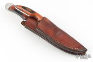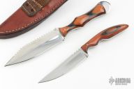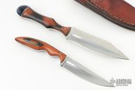 This is a knife set from Alex J Collins. The larger knife has a satin polished blade with sharpened top edge and sawteeth on the spine, .176" blade stock and 1.199" blade depth, full tang construction. The handle has Westinghouse paper micarta scales. The smaller knife has a mirror polished blade with notched thumbrest, .194" blade stock and .895" blade depth, full tang construction. The handle has Westinghouse paper micarta scales. Has some light scratches, otherwise excellent condition. Comes with a brown leather sheath that holds both knives.