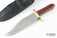 This Bowie by Kelgin Knives features a satin finished blade with false top edge, .200" blade stock and 1.984" blade depth, full tang construction. The handle has a brass guard and cocobolo wood scales. Comes with a black leather sheath. Excellent condition.