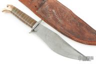 This Bowie features a satin finished blade with false top edge, .209" blade stock and 1.930" blade depth, full tang construction. The handle has a steel guard, stacked phenolis and aluminum spacers, brass boot pommel. Comes with a hand tooled brown leather sheath. Has scratches and patina, otherwise good condition for what it is.
