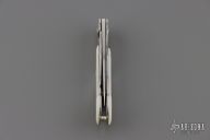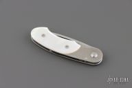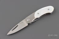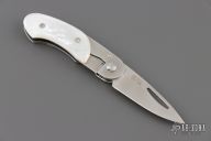 This knife features a satin finished drop point blade. The handle has a steel frame with mother-of-pearl scales. Includes the original box and papers. Excellent Condition.