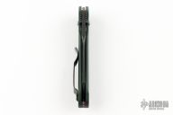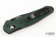 This 940BK Osborne Axis Lock Folder from Benchmade has a black coated partially serrated clip point blade with false top edge and dual thumbstuds. Handle is green anodized aluminum with blue anodized spacer, and black finished stainless steel tip up clip (RH/LH Reversible). Nice blade seating and lockup. Comes with original box, drawstring pouch and papers. Has scuffs and scratches, good condition otherwise.
