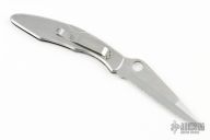 This Police Lockback from Spyderco has a satin finished clip point blade with full serrations and thumb hole. Handle is stainless steel with stainless steel back spacer (lock), and stainless tip down clip. Has scuffs and scratches good condition otherwise.