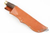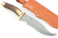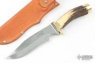 This Bowie Knife by J Nowill & Sons features a polished blade with .369" blade stock and 1.665" blade depth, hidden tang construction. The hand has a brass guard and butt with a stag grip. Comes with a brown leather sheath. Has some light scratches and patina, otherwise good condition.