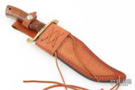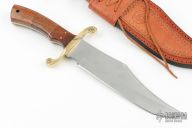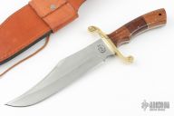 This Bowie from Colt Knives features satin finished blade with Colt logo on presentation side, .177" blade stock and 1.785" blade depth, full tang construction. The handle has a brass guard with wood scales and brass spacers, lanyard hole in pommel. Comes with a brown leather sheath. Has some light scratches, otherwise excellent condition.