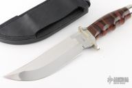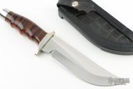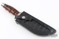 This Bowie by Lowell Cobb features a mirror polished blade with false top edge, .242" blade stock and 1.808" blade depth, hidden tang construction. The handle has a nickel silver guard and stainless steel butt, stacked wood grip and yellow/black spacers. Comes with a black leather sheath with alligator skin inlay. Has a small crack in the handle, otherwise excellent condition.